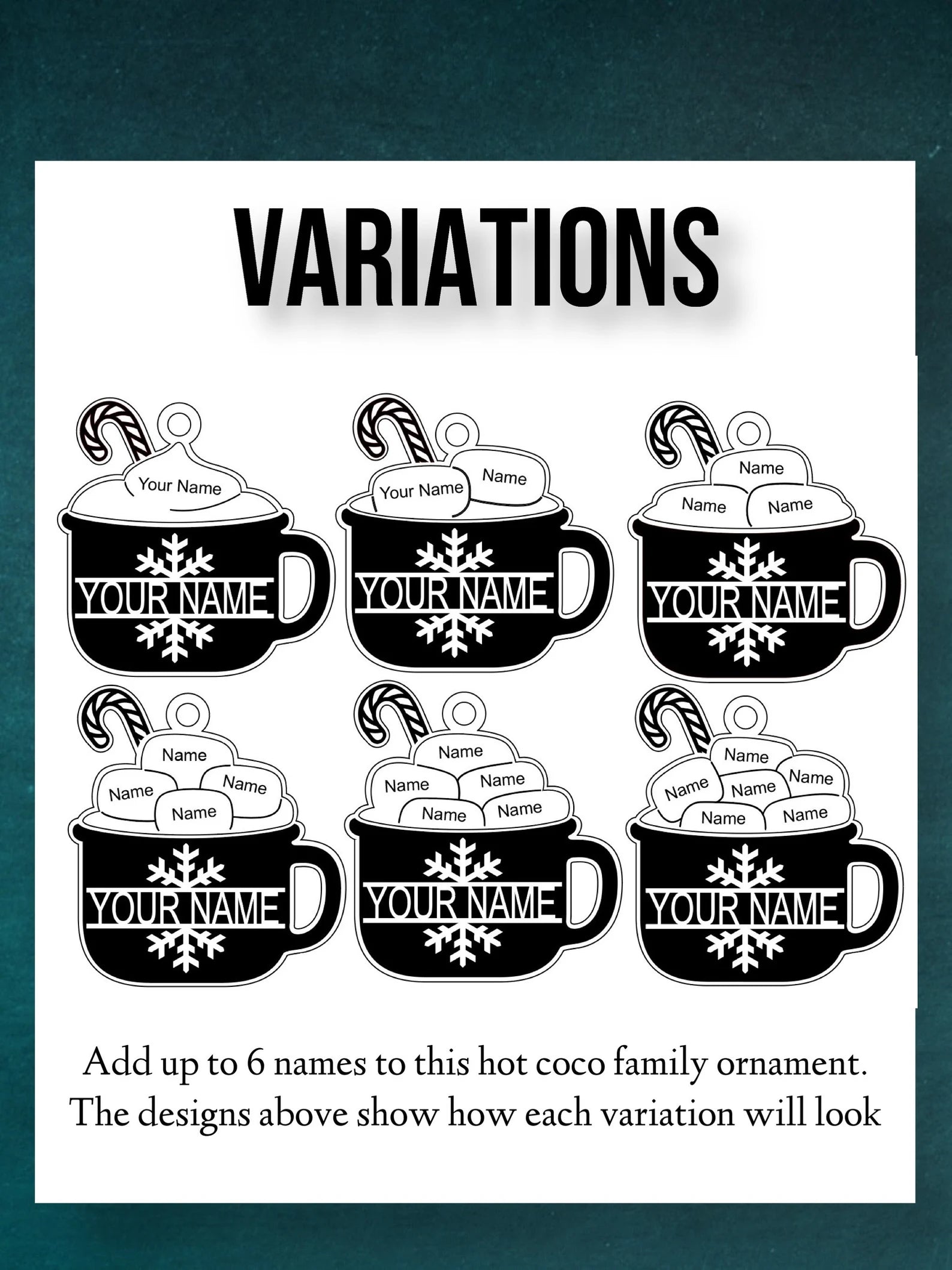 This laser engraved family Christmas ornament is the perfect custom piece for your tree, representing each of your family members. Made with classy black and white wood, with your custom last name welded into an intricate snowflake - the piece stands out from others. It has a beautiful simplistic minimal design, and makes a great custom gift for friends & family members this holiday season. The details of this piece set it apart! Add up to 6 names on each of the marshmallow features of this hot cocoa ornament. See our photos for the variations of the six different styles we provide.